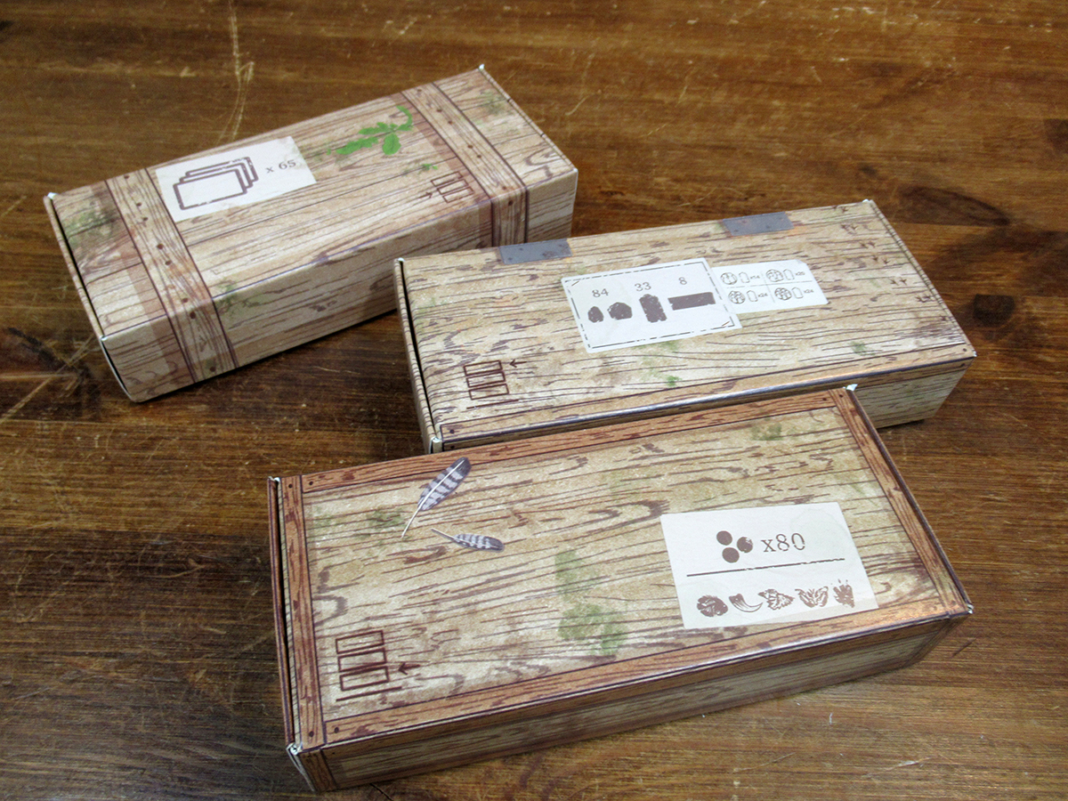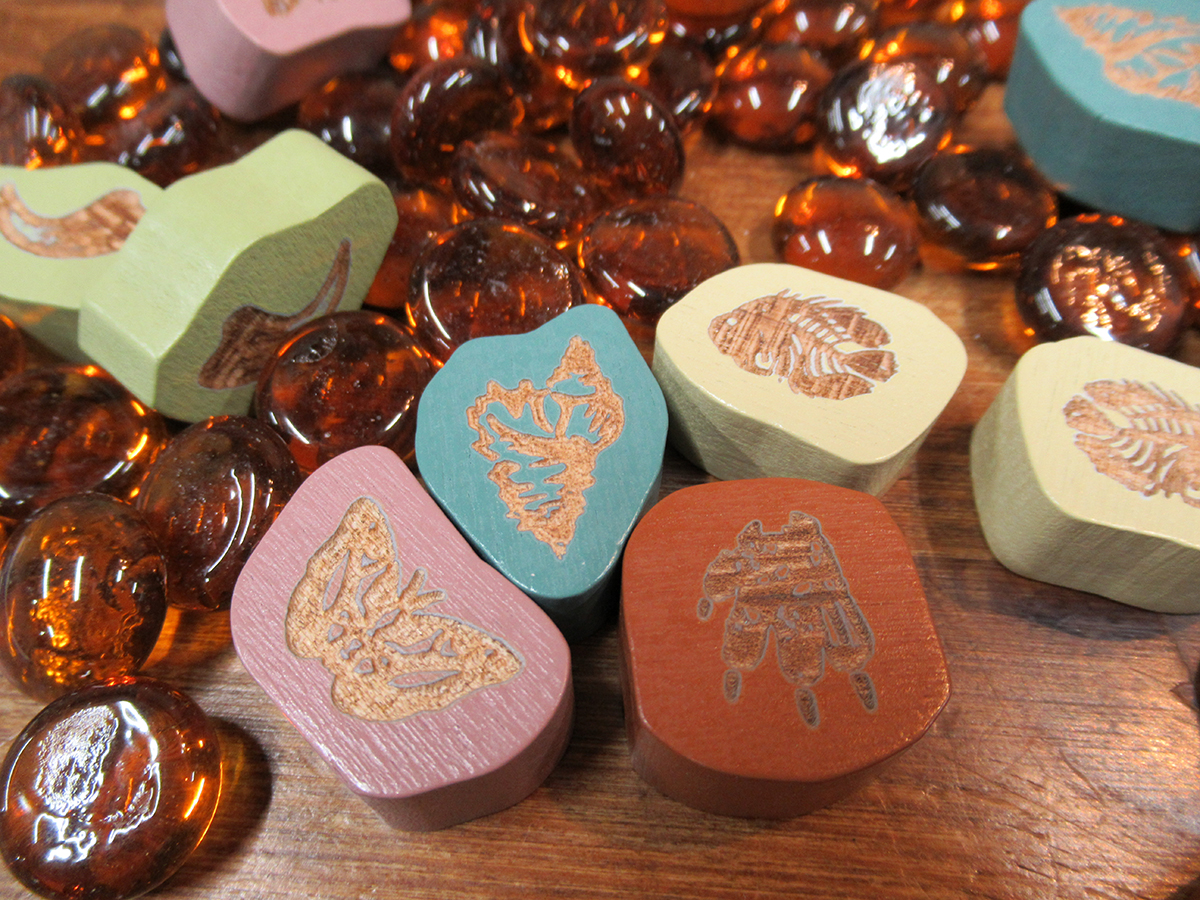 発掘現場に送り込む各プレイヤーのマーカーは、レーザー加工でエングレーヴが施されている……ゲーム内での通貨となる琥珀トークンもそれらしい色で雰囲気ばっちり(実際の琥珀はガラスはおろかプラスチックより軽いのだけどそこは雰囲気)