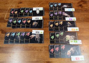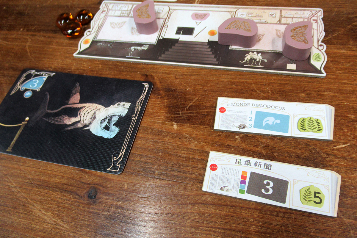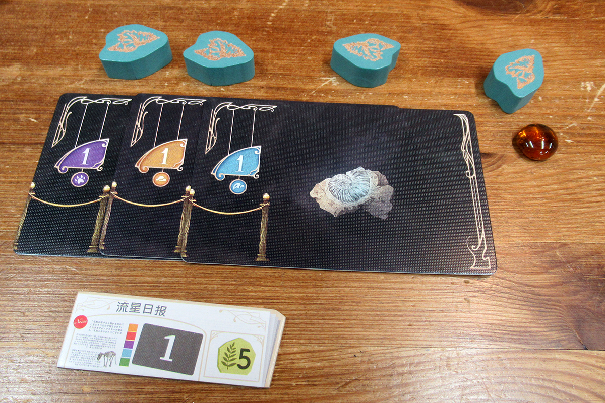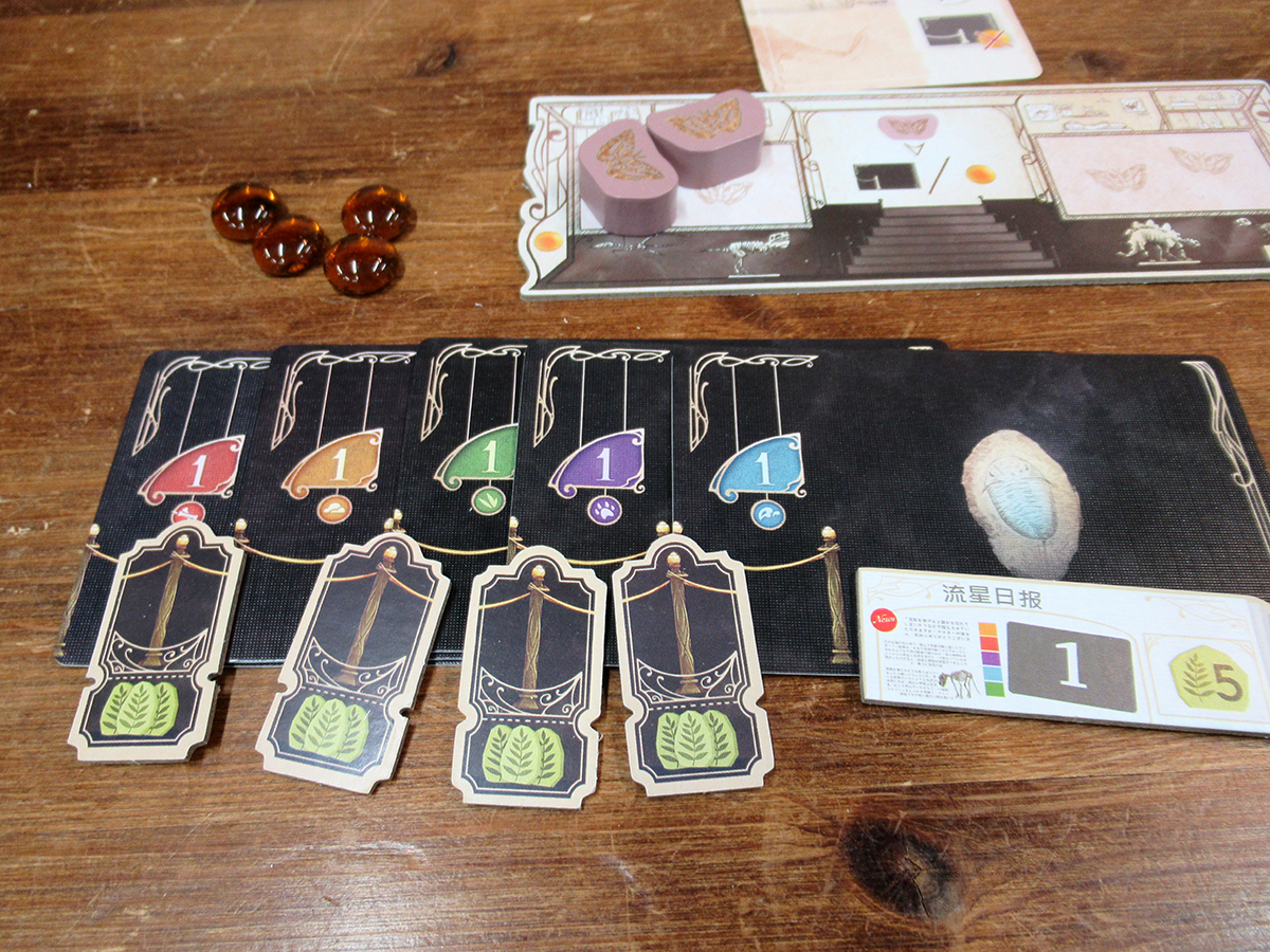 各プレイヤーには自分の博物館ボードと対応する色のマーカー4個と琥珀を2個受け取ります。