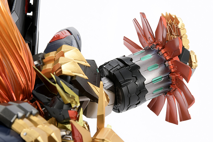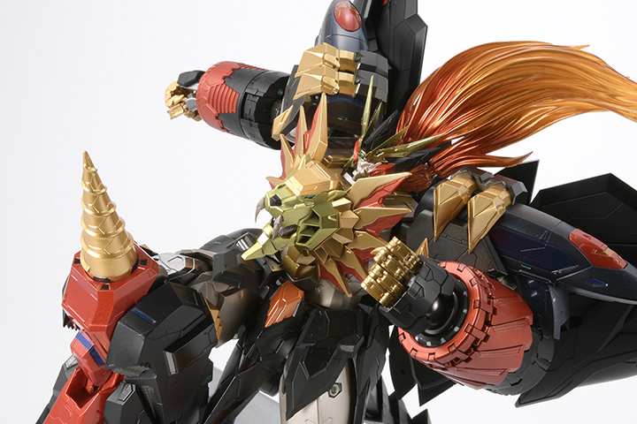 力強い造形が織りなす迫力のシルエット、変形合体機構を敢えてオミットしたことで実現された非常に高いアクション性を持つ可動ギミック、重厚さを引き立てるための塗装表現。そして、全身の関節各所に使用されたダイキャストパーツが、可動の安定性を実現するとともに、ズッシリとした重厚感を実現。ありとあらゆる部分をこだわり抜いた、まさに“究極”の造形アイテムとなっている。
